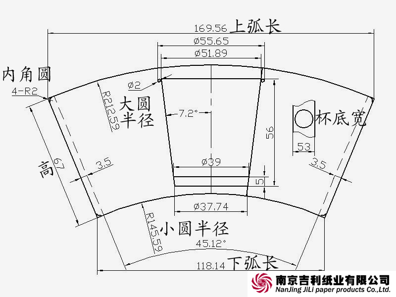 下弧長::118.14mm 、內(nèi)角圓半徑:R2 、高度:67mm 、杯底寬:53mm